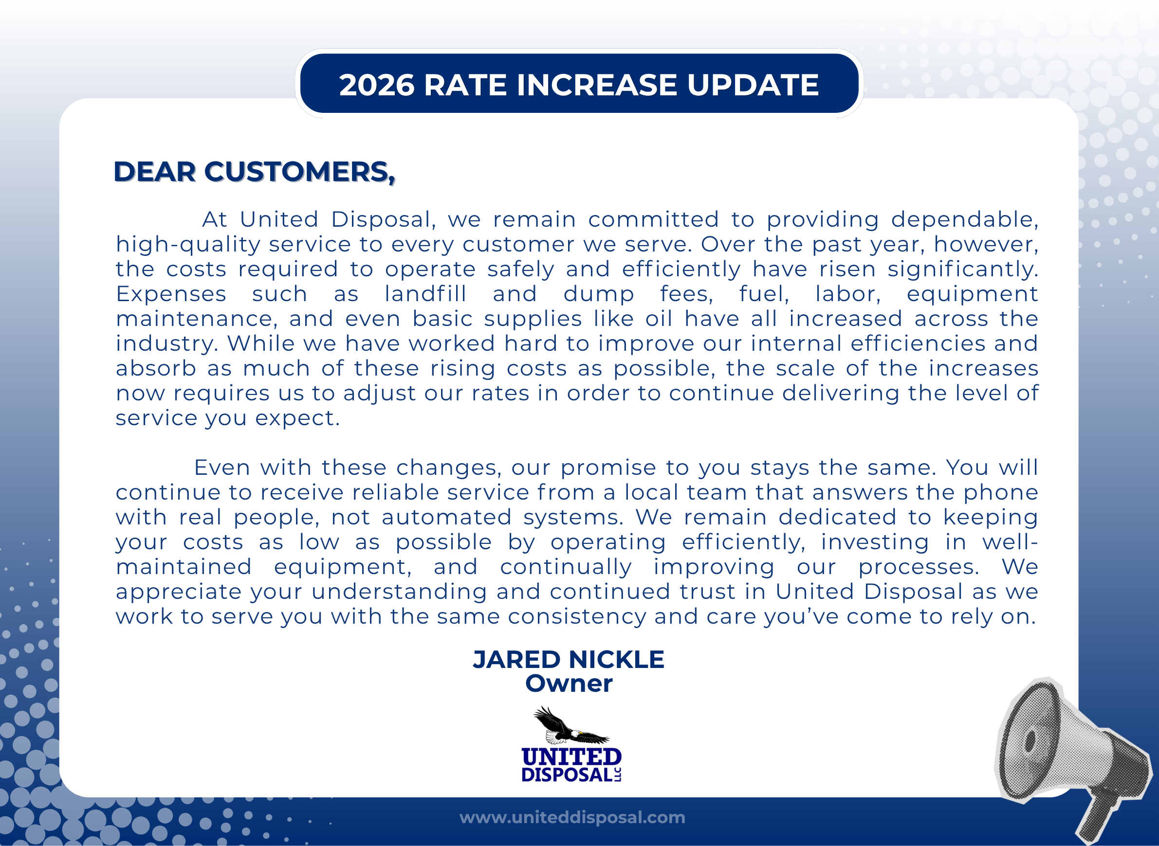 2026 Recycling Calendars are out please click, download, and use your 2026 Recycling Calendar now. It is a simple step that supports your home, your community, and the environment. United Disposal is proud to serve you, and we look forward to another year of reliable, friendly recycling service.